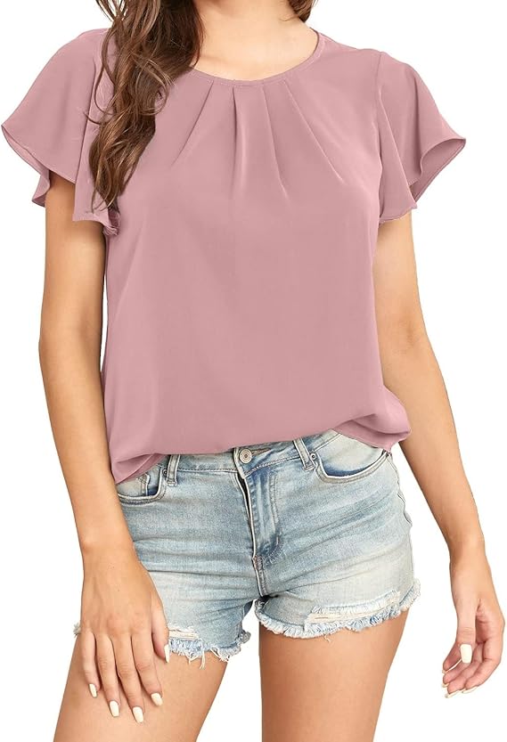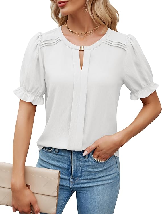 Women's Casual Round Neck Basic Pleated Top Ruffle Sleeve Curved Keyhole Back Blouse