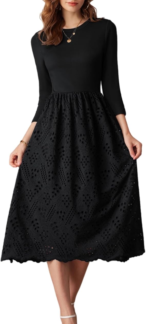 Womens Summer 3/4 Sleeve Dress with Pockets A Line Midi Eyelet Dress Empire Waist Casual Fall Flowy Dress