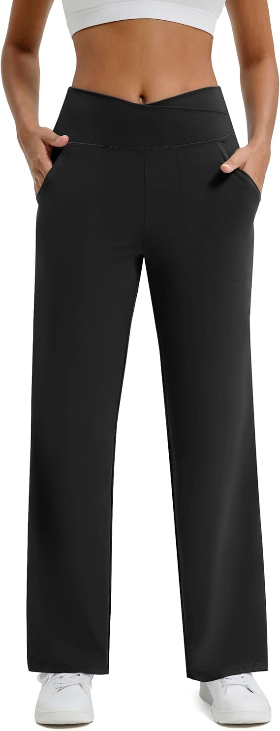 Wide Leg Pants for Women Casual Work Pants Crossover High Waisted Yoga Pants with Pockets